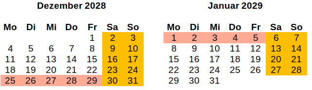 Коледна ваканция 2028/2029 в Бавария (календар).